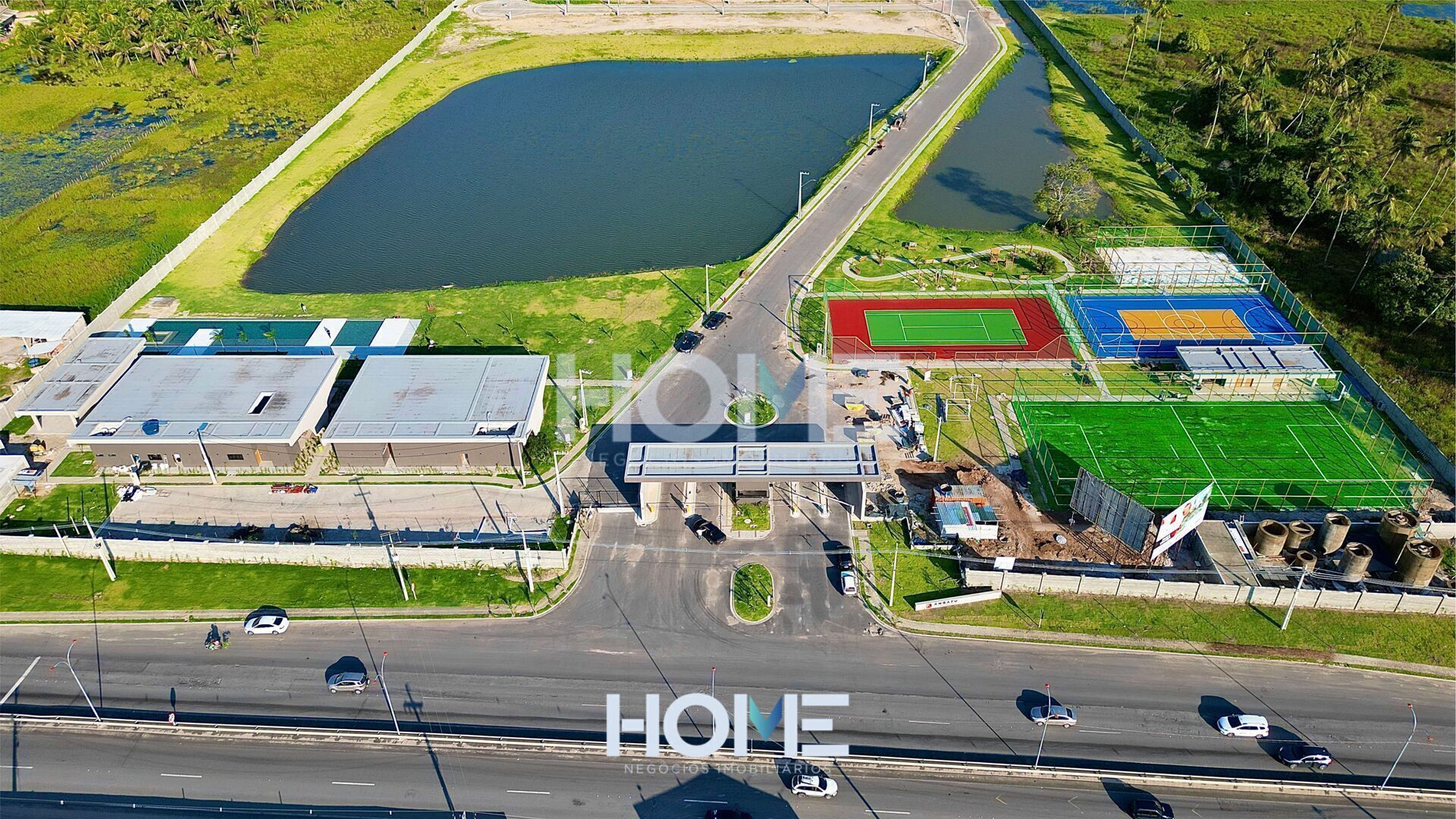 Área esportiva com; Quadra poliesportiva, Campo de futebol, quadra de tênis. 02 lagos, Super Guarita de segurança.