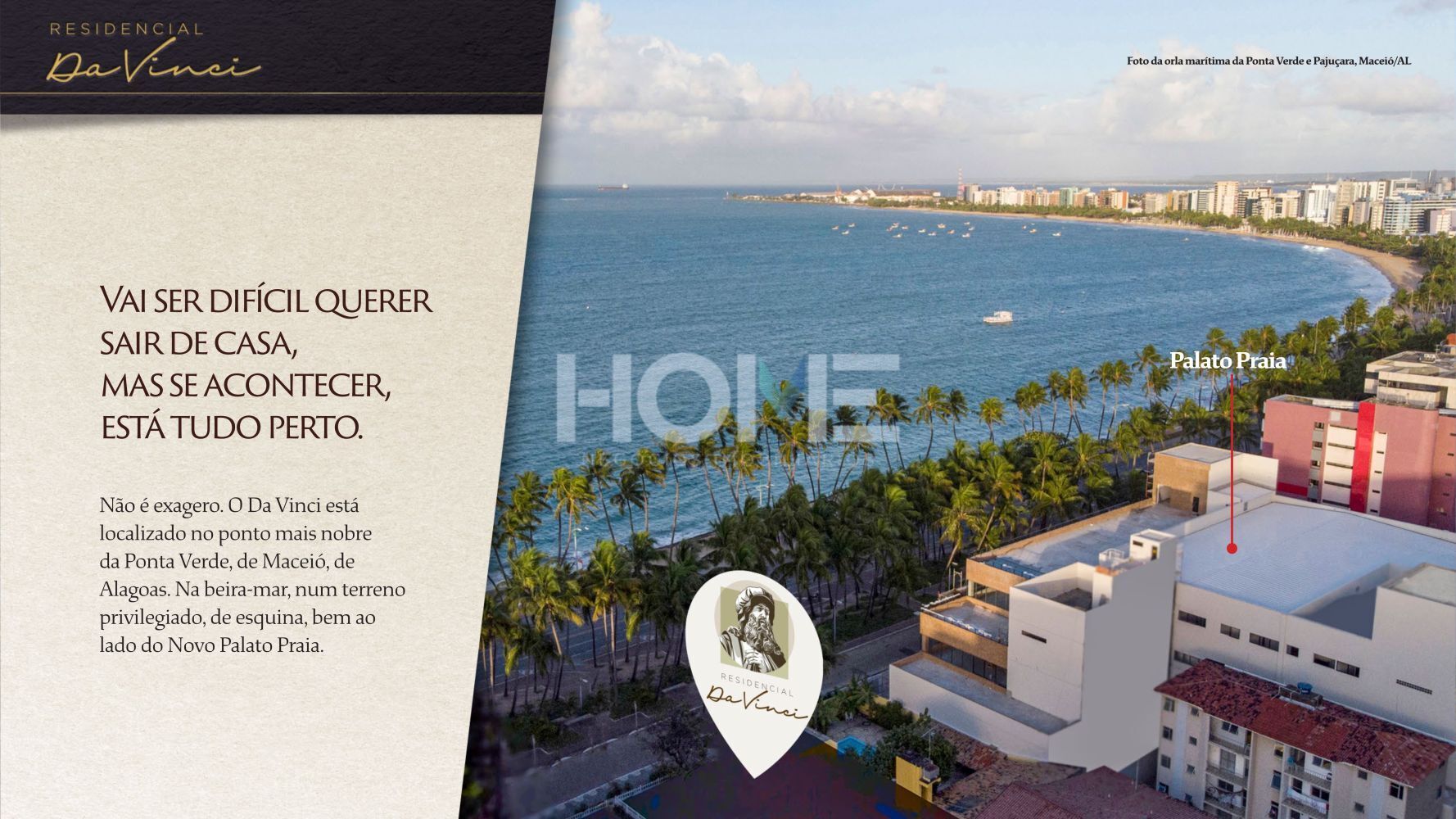 Não é exagero. O Da Vinci está localizado no ponto mais nobre da Ponta Verde, de Maceió, de Alagoas. Na beira-mar, num terreno privilegiado, de esquina, bem ao lado do Novo Palato Praia.