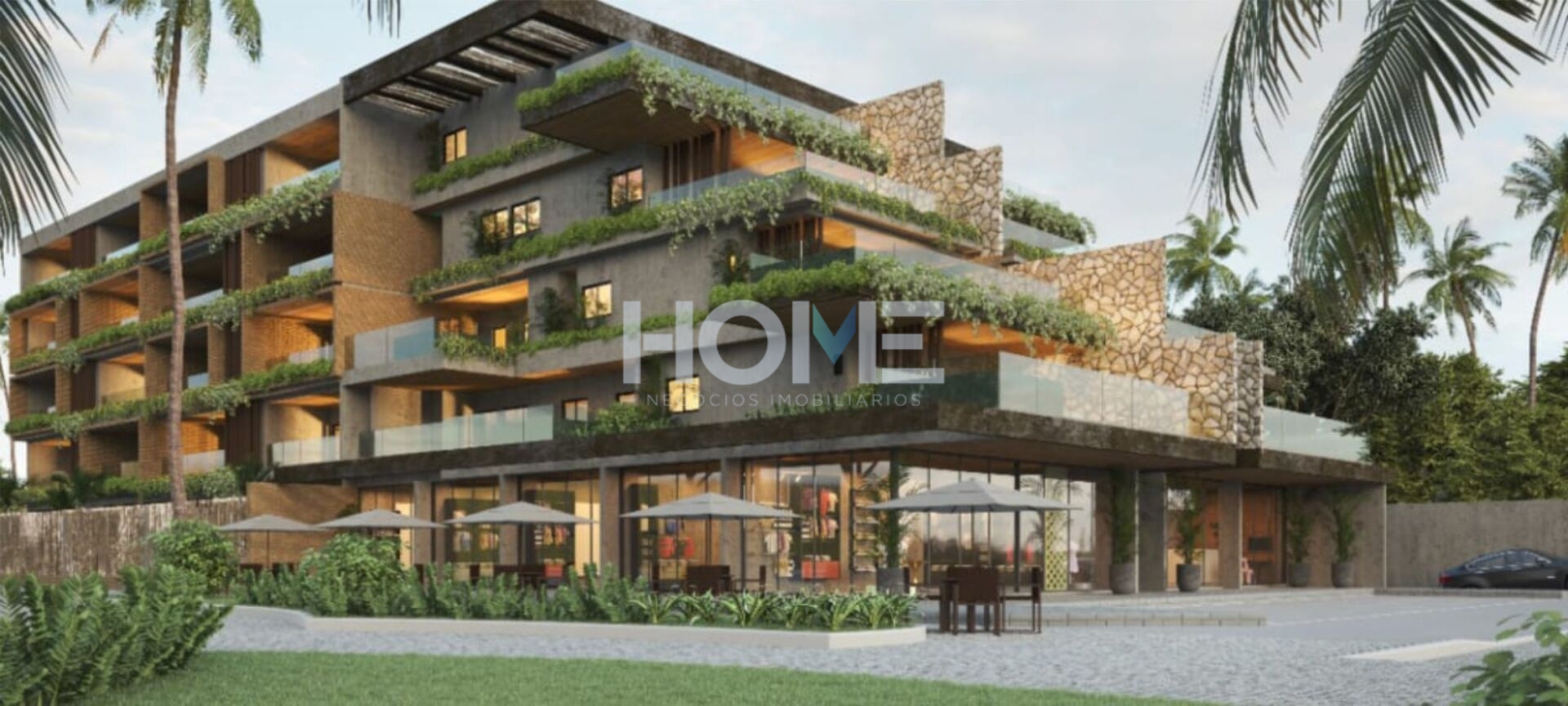 Fachada ativa com café, sorveteria, salão de beleza e galeria de arte.
