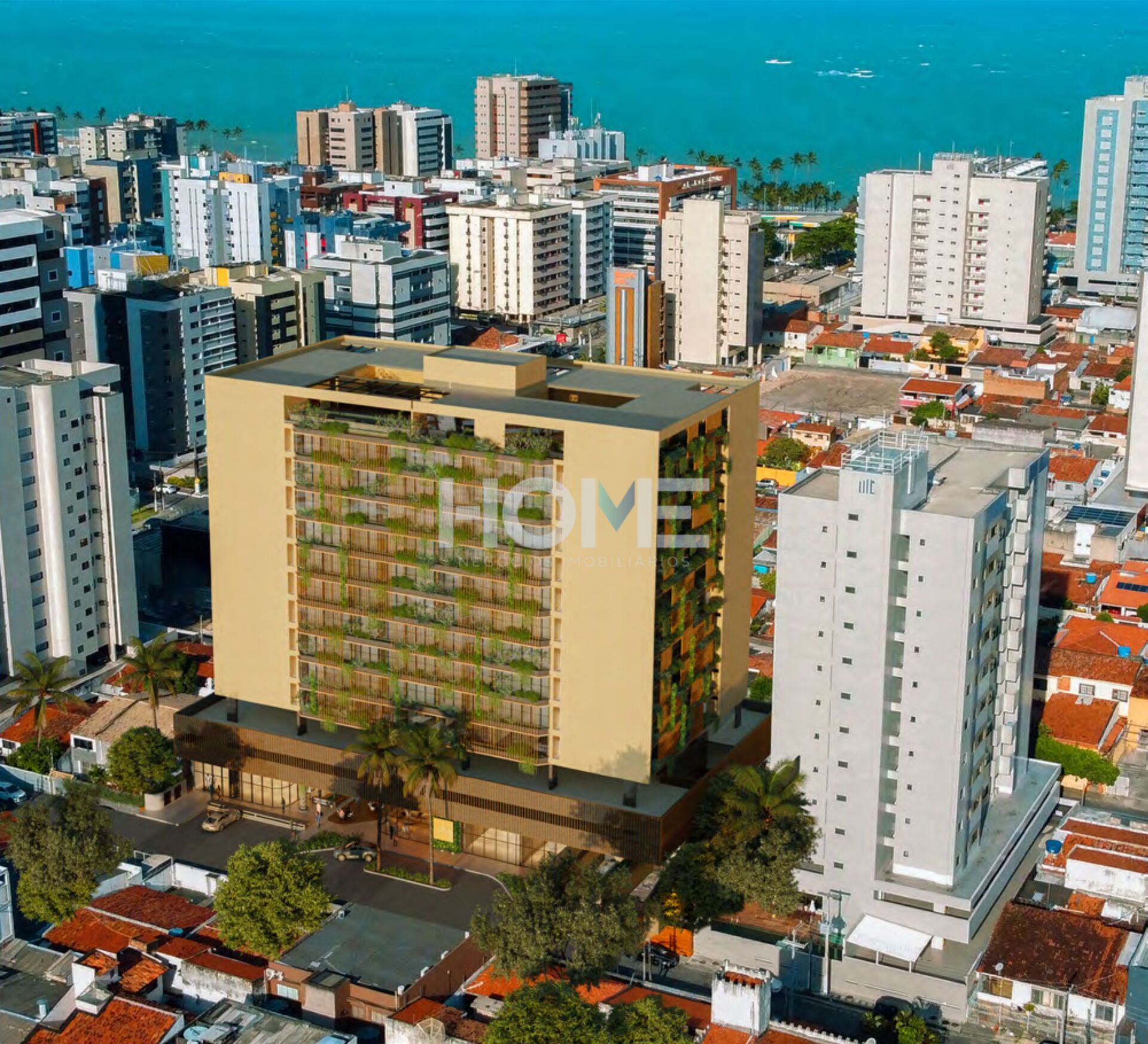 A fachada verde e design biofílico revelam a integração da natureza ao ambiente urbano, entregando a sensação de conexão com o verde e evocando bem-estar, conforto e