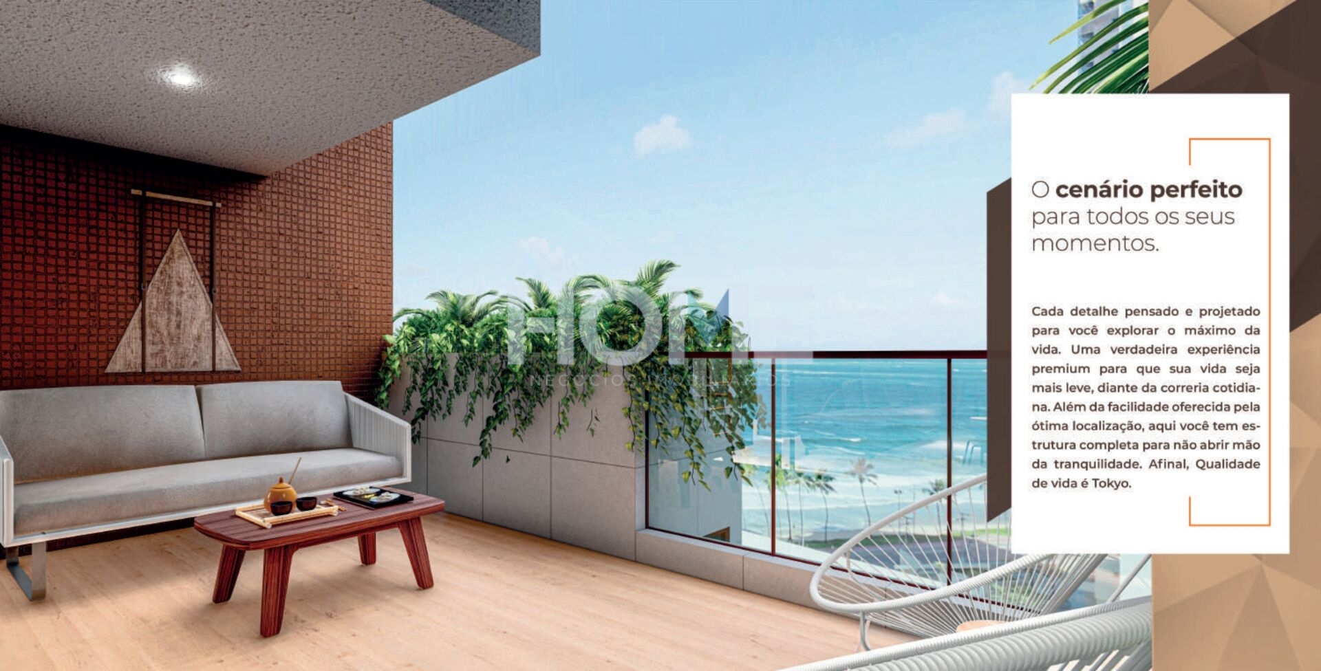 Esbanjando sofisticação, o Tokyo possui o melhor que há em moradia. As unidades contam com cozinha americana, suítes e lavabos, além de uma vista paradisíaca da cidade e da praia.